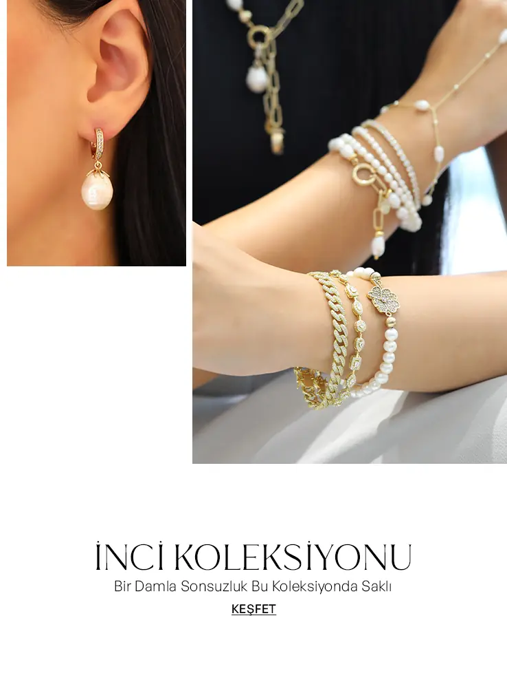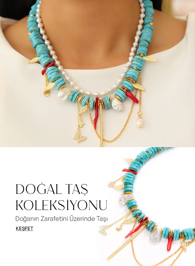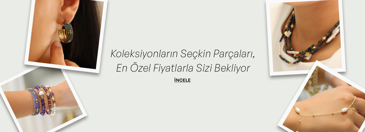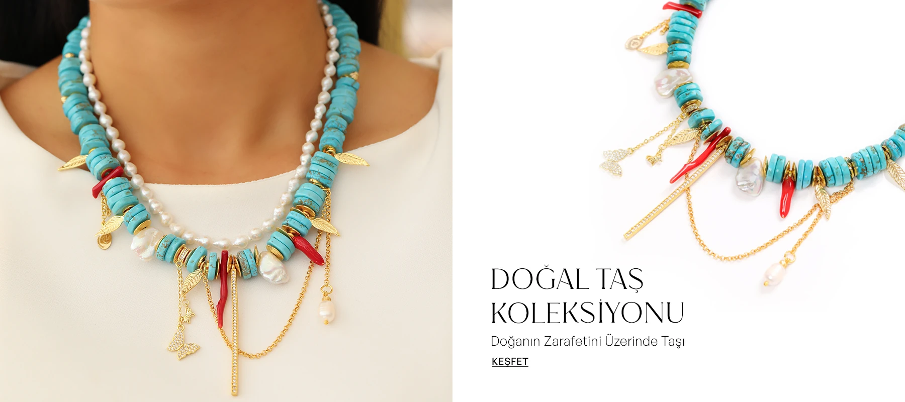 Doğal taş ve inci kolyeler, zincir ve tiffany detaylı tasarımlar, zarif bileklik ve yüzük seçenekleri; hem günlük kullanım hem de özel günler için ideal.