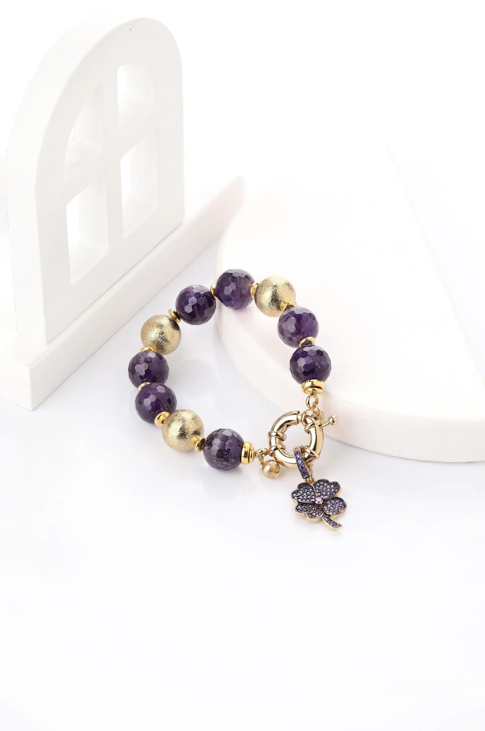 Zarafeti ve enerjiyi bir arada taşıyan bu bileklik, ametist taşının derin rengini çiçek detaylarıyla buluşturuyor. Hem şıklığınızı artıracak hem de pozitif enerjinizle etrafınızdakilere ilham verecek. Doğanın en güzel dokunuşunu bileğinizde taşıyın.