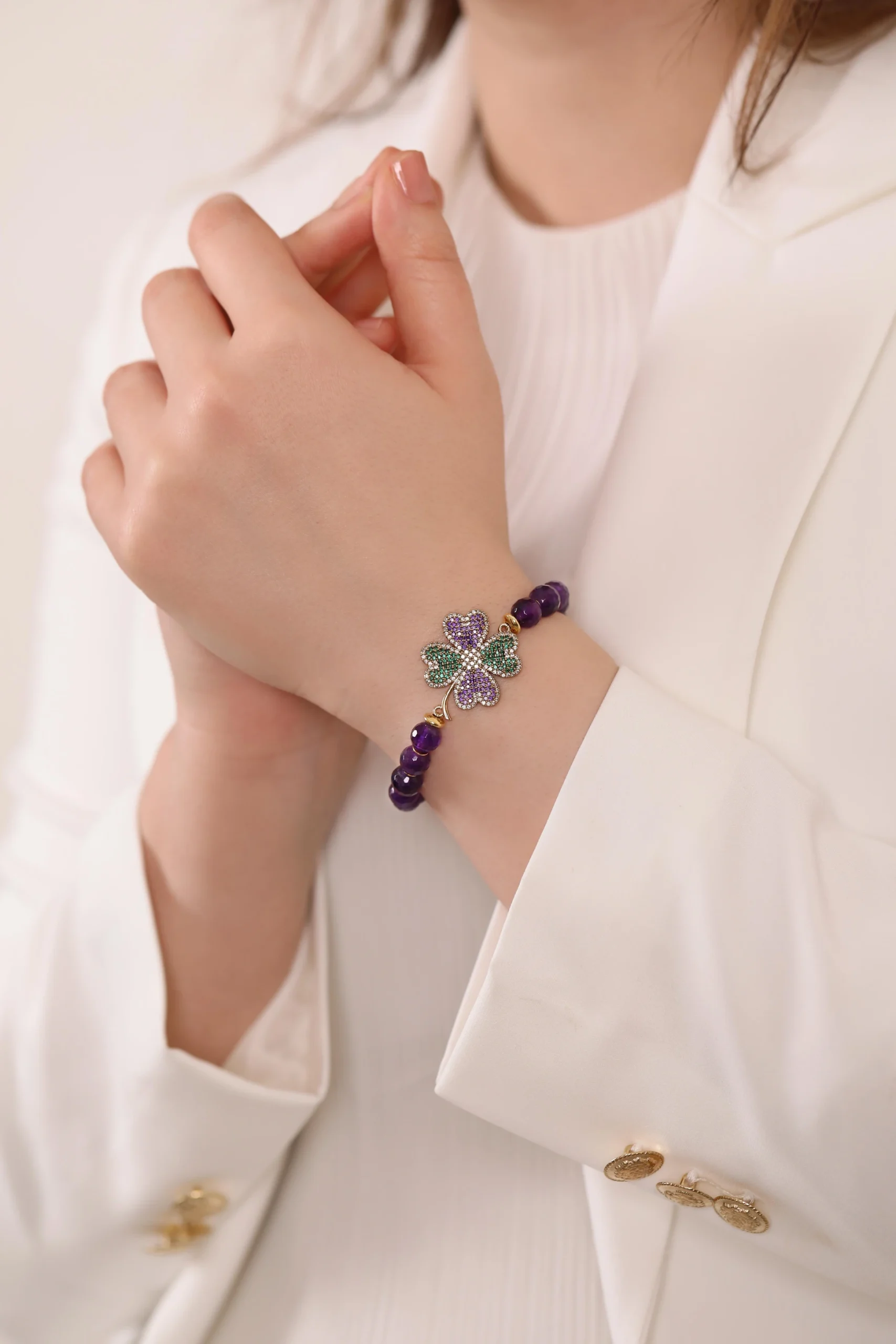 🍀💜 Yonca detaylı ametist taşı bilekliğimiz, zarif tasarımı ve enerjisiyle her anınıza ışıltı katacak. Ametistin huzur verici gücüyle şansınızı arttırın, tarzınızı yansıtan bu özel parçayı keşfedin.