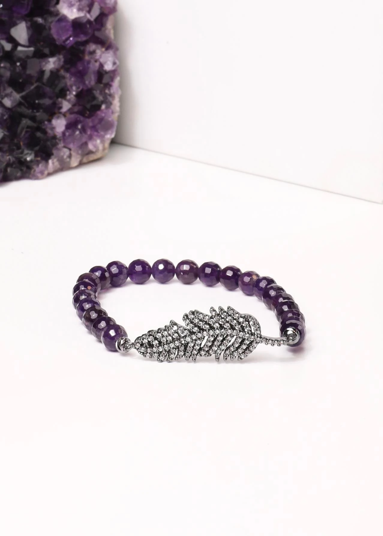 “Doğanın zarafetini bileğinizde taşıyın! Yaprak detaylarıyla süslenmiş ametist taşı bilekliğimiz, hem şıklığı hem de huzur verici etkisiyle sizi saracak. Enerjinizi dengeleyin, stilinize zarif bir dokunuş katın!”
