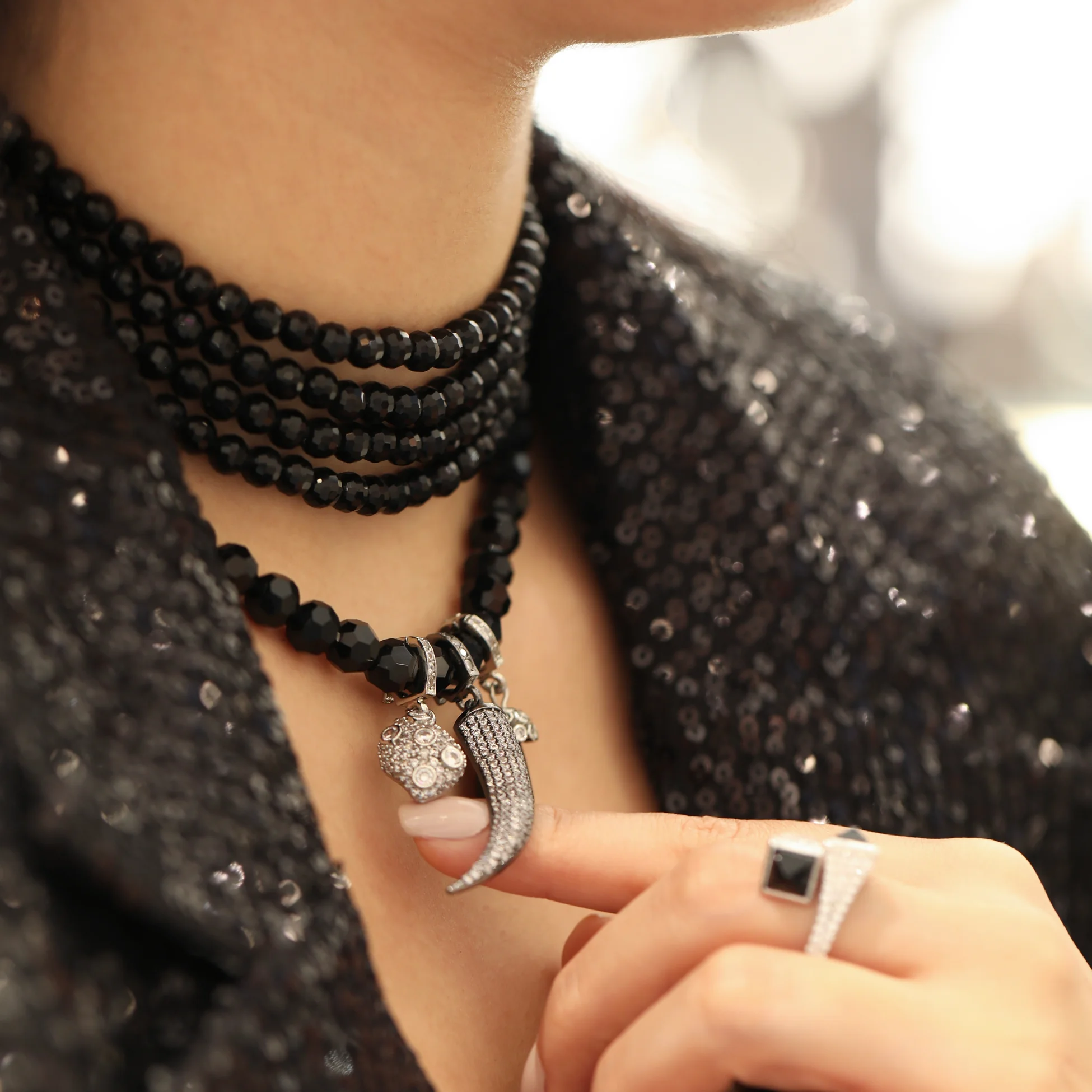 Beş sıra kristalin birleşimi, sade kombinlere sofistike bir dokunuş katmakla kalmıyor; gece davetlerinden günlük kombinlere kadar her an stilini öne çıkarıyor. Minimal ama çok yönlü duruşu, modern kadının cesur ama zarif stil anlayışıyla mükemmel bir uyum içinde.