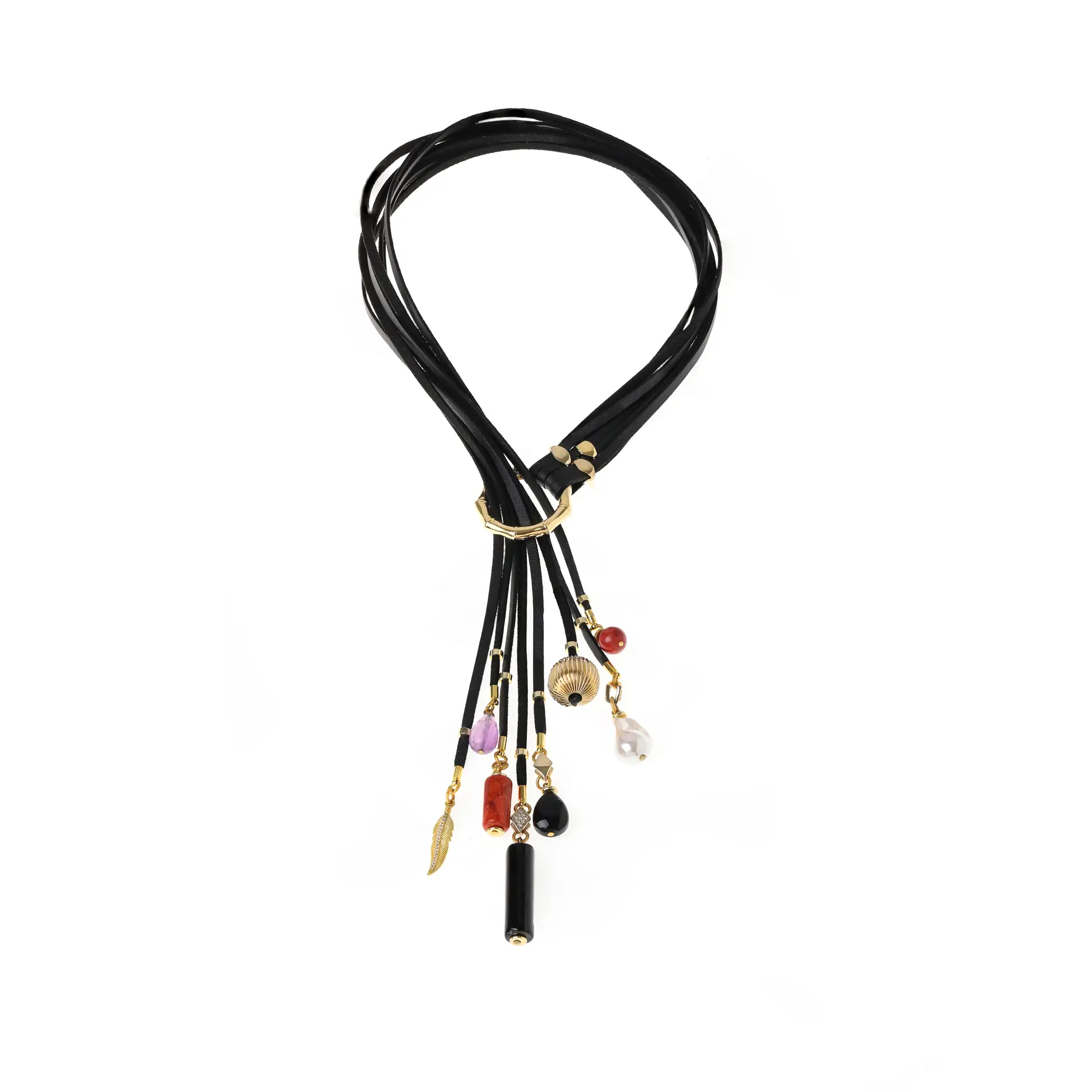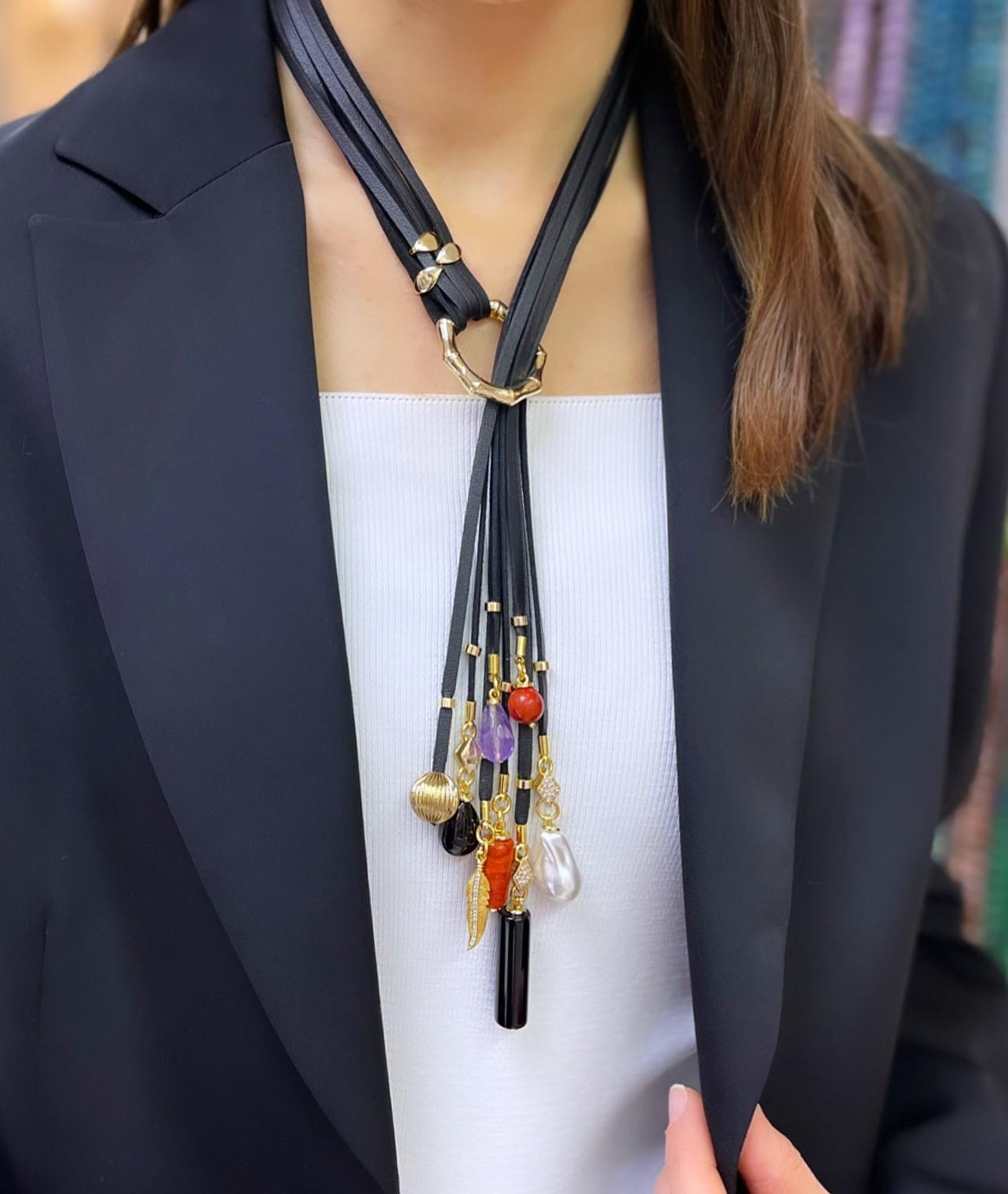 - Deri, doğaltaş ve altın kaplama detaylı flar kolyemiz 75 santim uzunluğundadır ortadaki halka açıp kapanır kilitlidir.