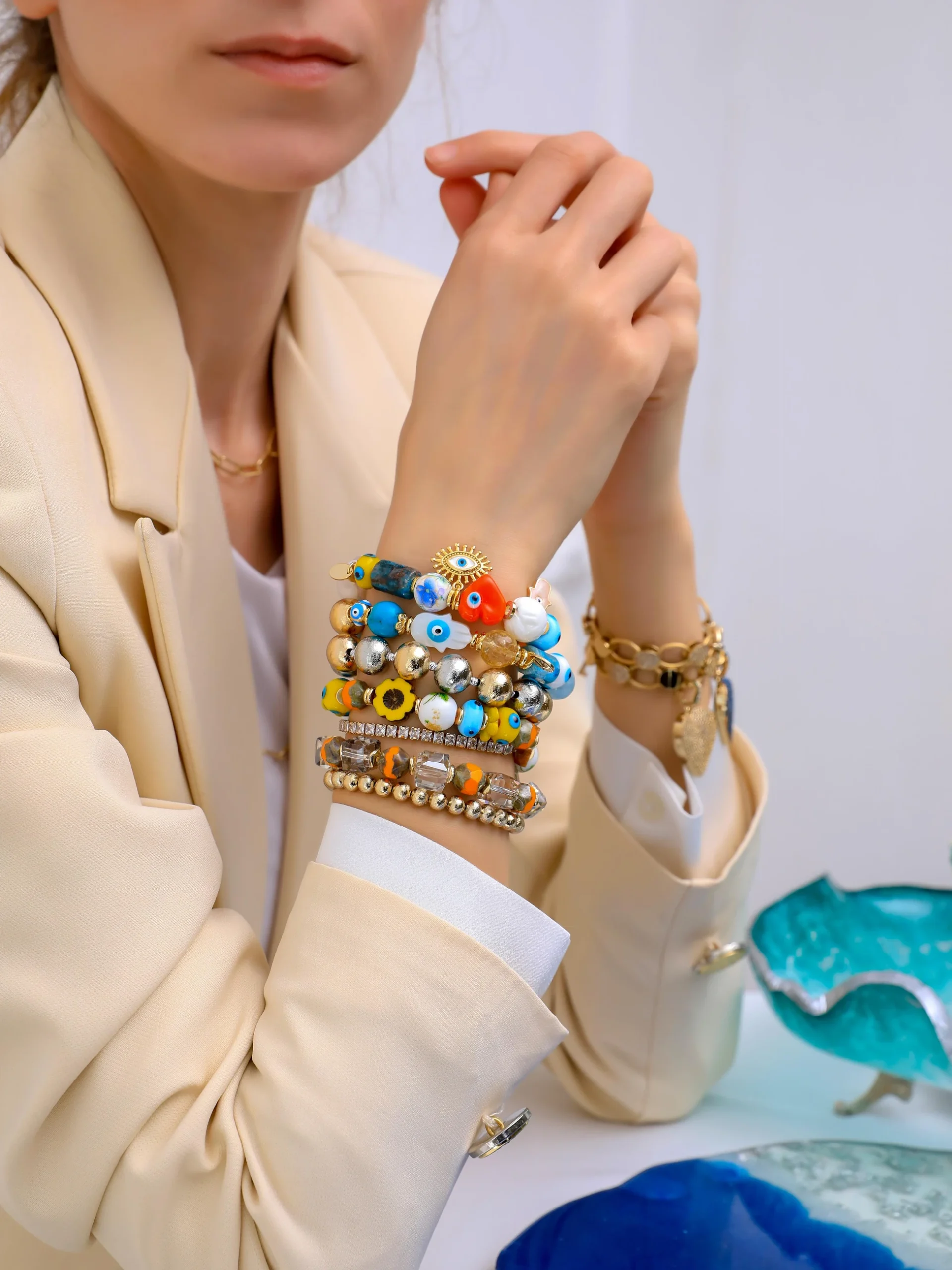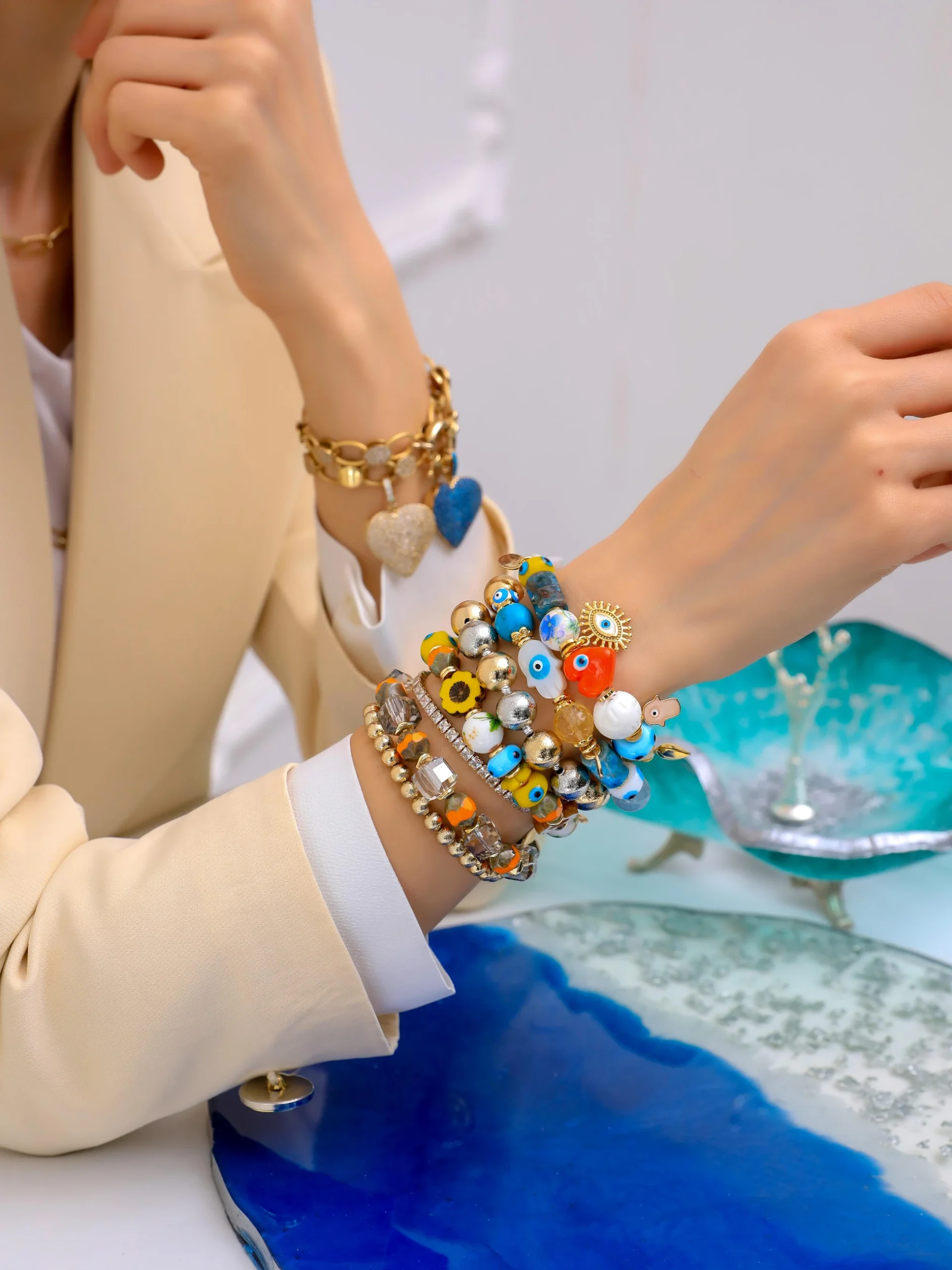 - Kullanılan nazar boncukları el yapımı camdır.