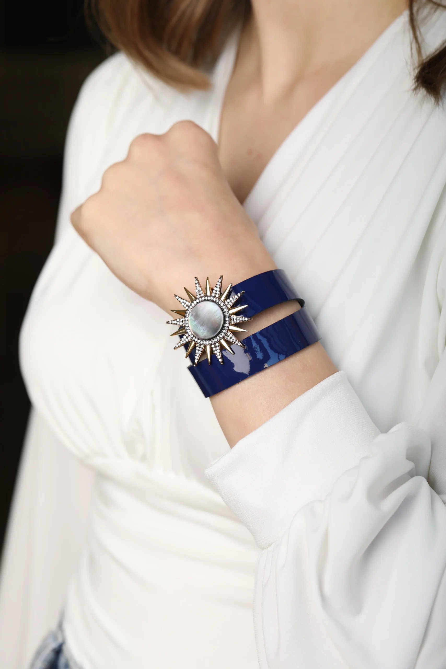 “Işıldayın ve parlayın! Güneş figürlü rugan deri bileklik, hem enerjisiyle sizi sarar hem de tarzınızı tamamlar. Göz alıcı tasarımı ve zarif detaylarıyla her anınıza ışık katacak, şıklığınızı vurgulayan mükemmel bir aksesuar.”