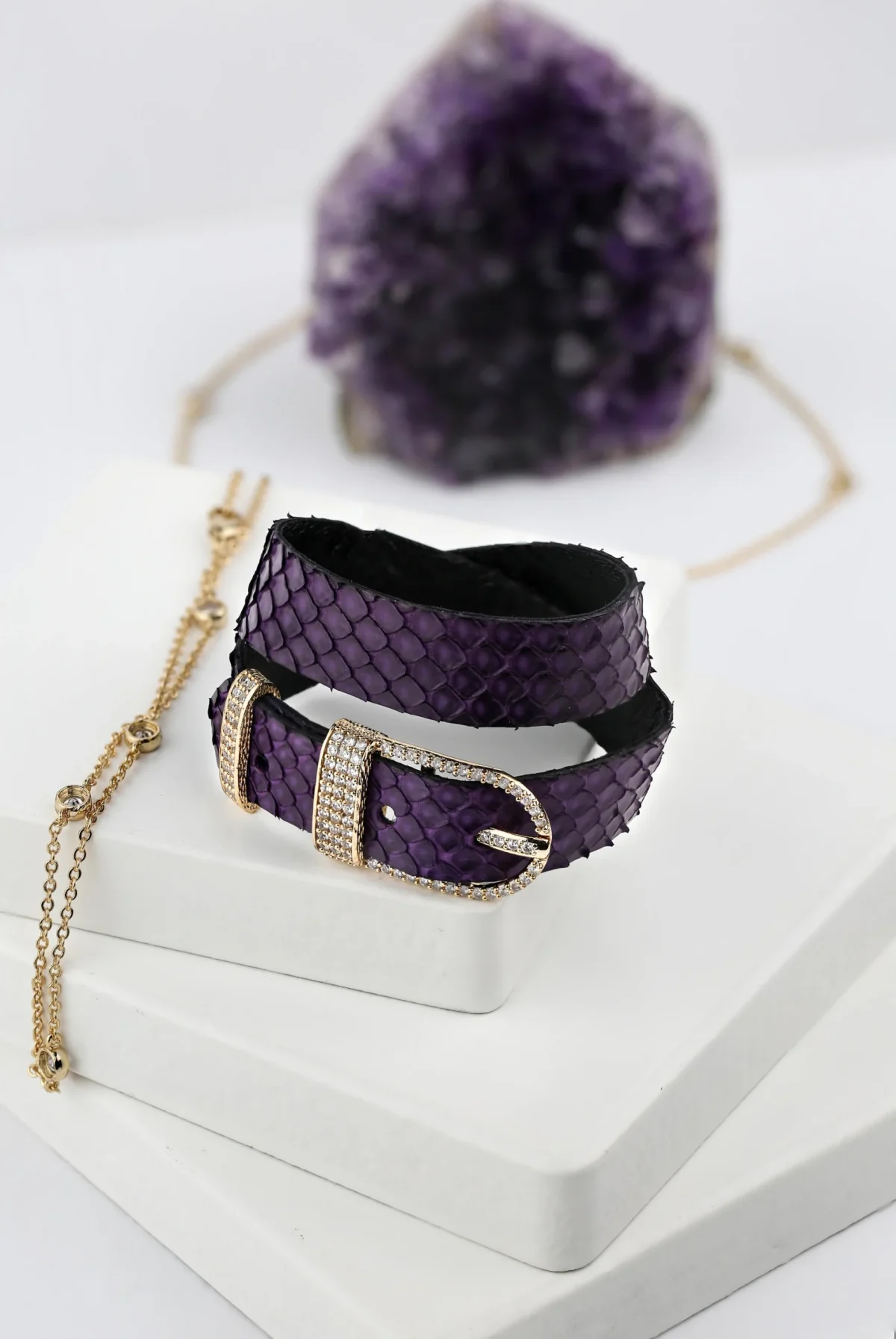 “Göz alıcı mor deri, pırlanta detaylarıyla birleşiyor. Şıklığınıza zarif bir dokunuş katacak bu deri bileklik, her kombinle mükemmel uyum sağlar.”