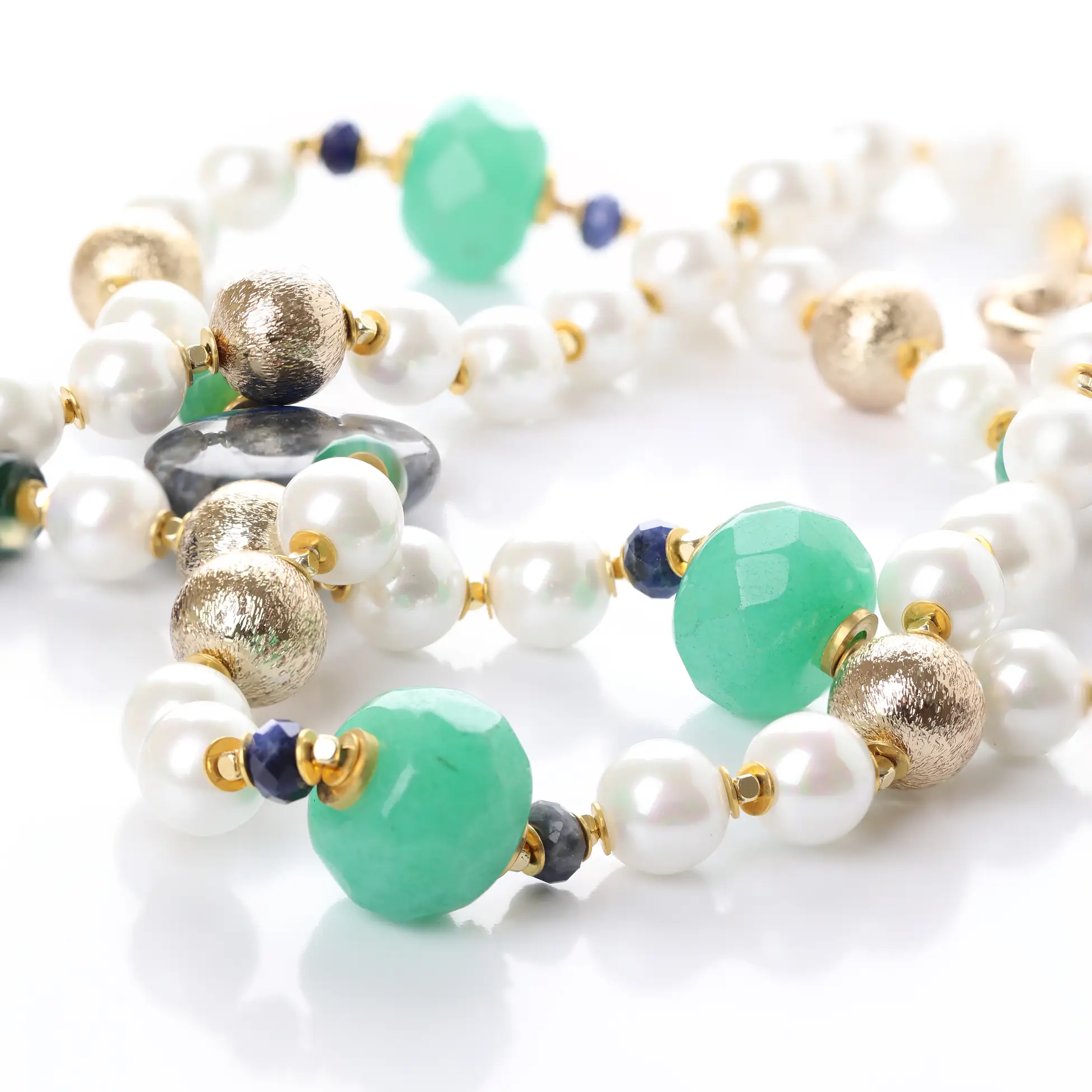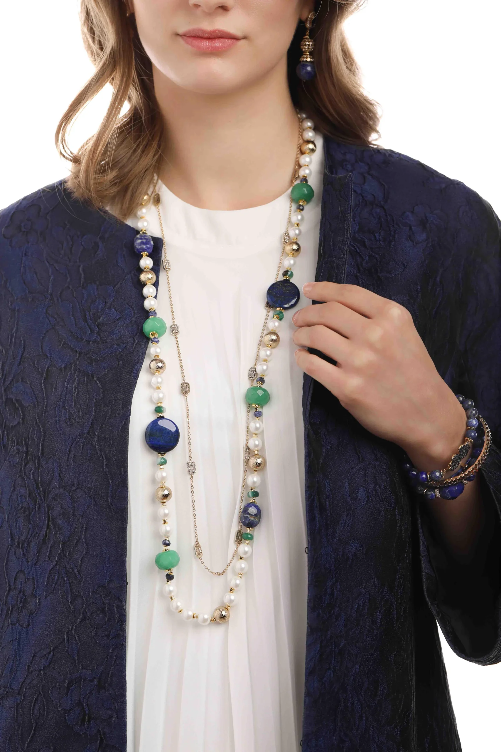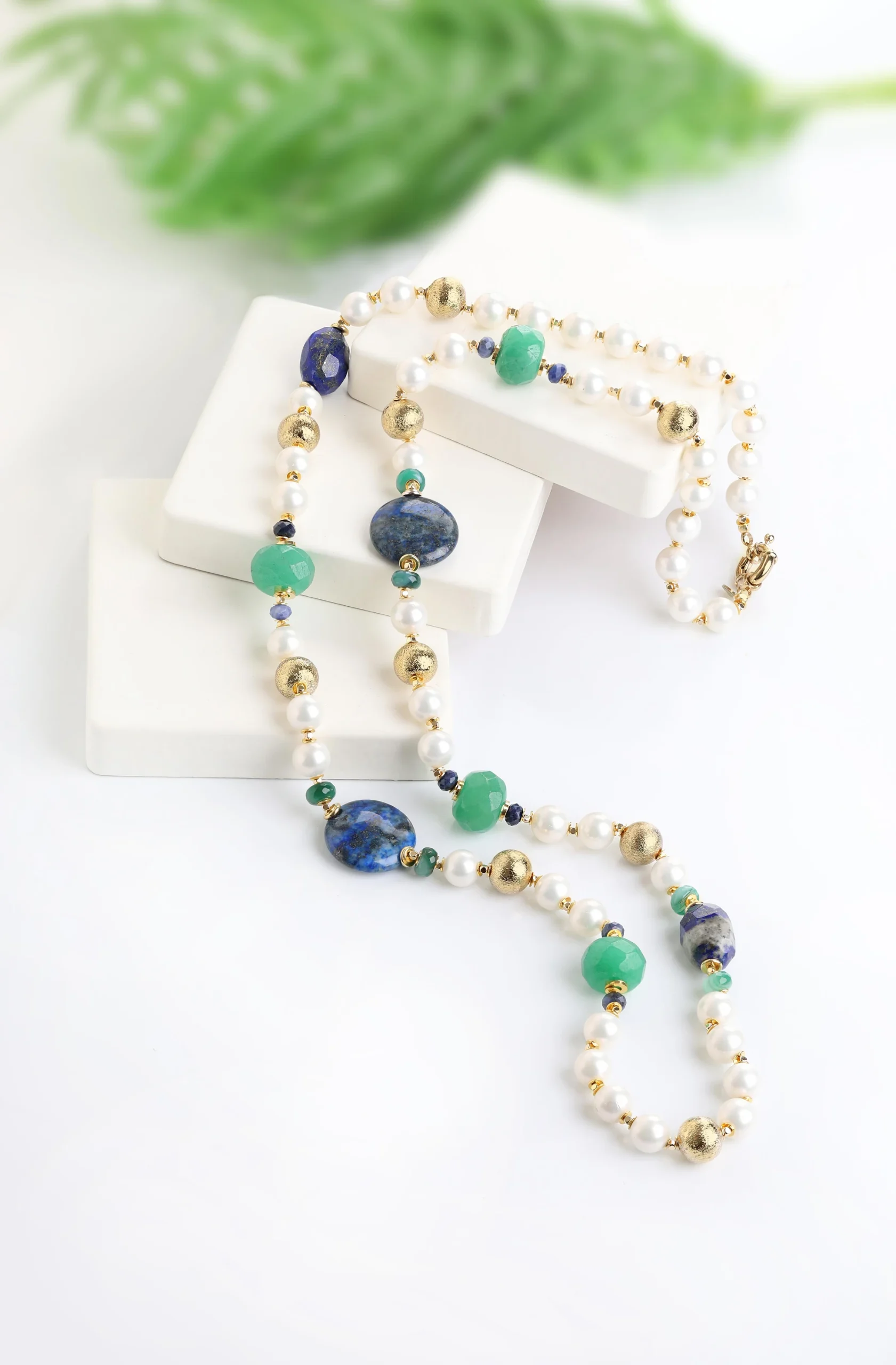 “Lapis lazuli’nin derin mavi tonları ve inciyle buluşan zarafetiyle stilinizi taçlandırın. Bu özel tasarım kolye, bilgelik ve zarafetin mükemmel uyumunu yansıtıyor. Hem klasik hem de modern bir dokunuş arayanlar için ideal.”