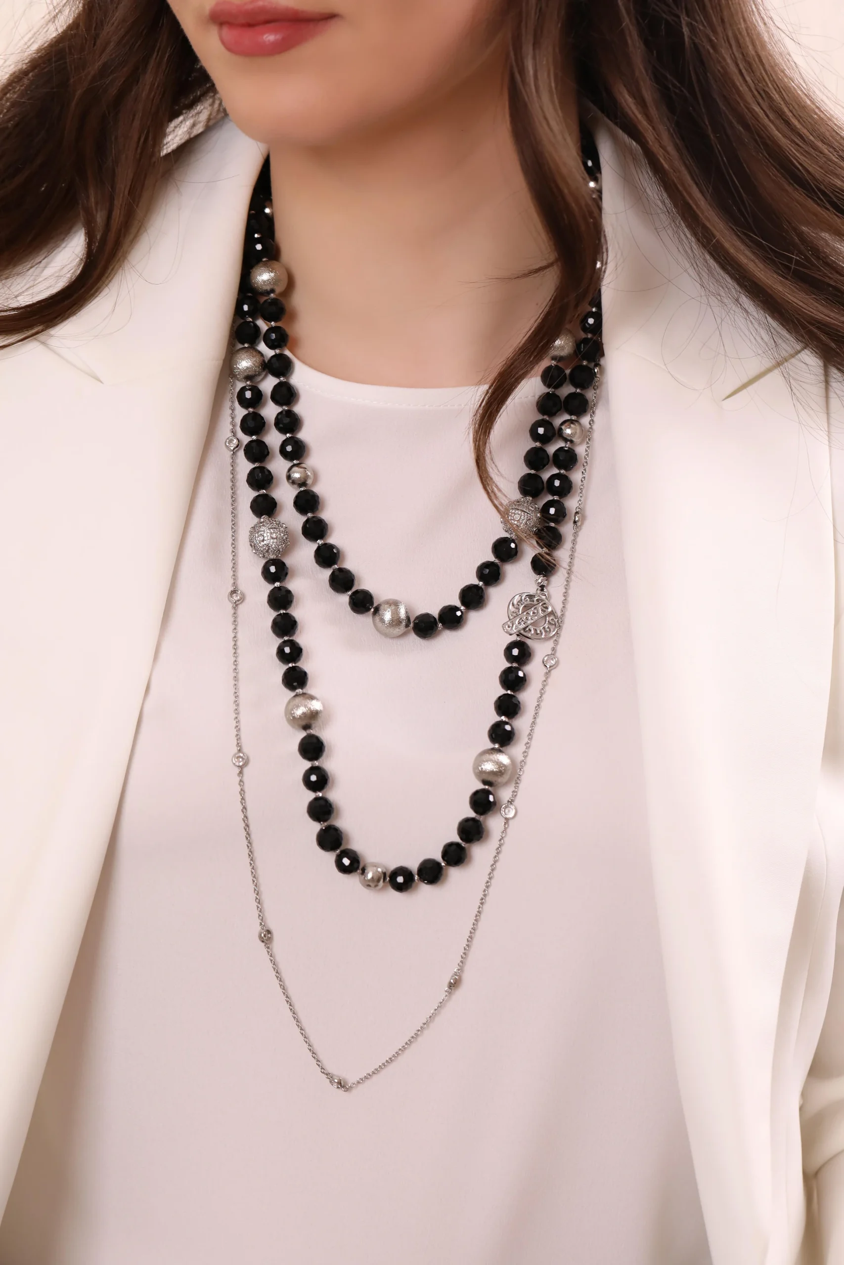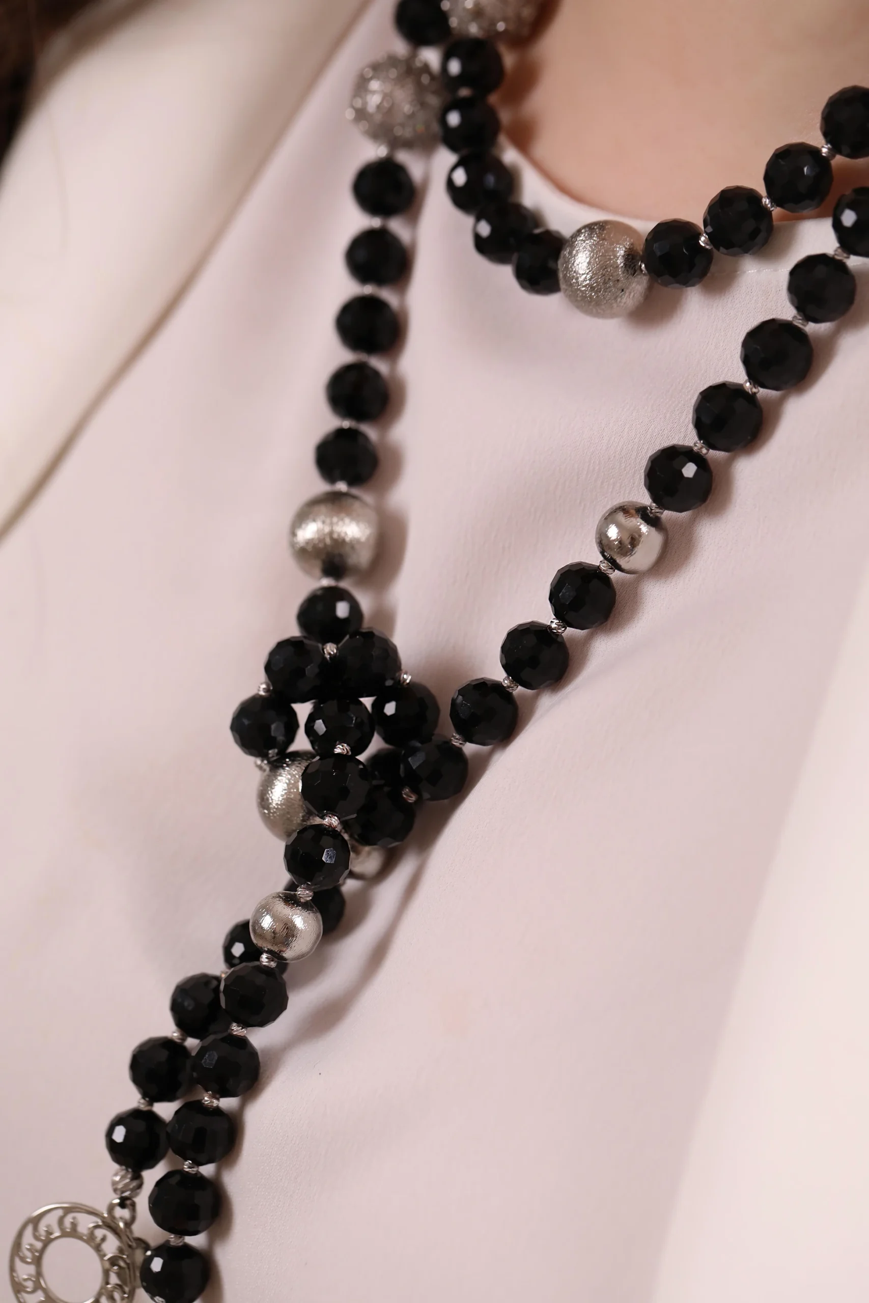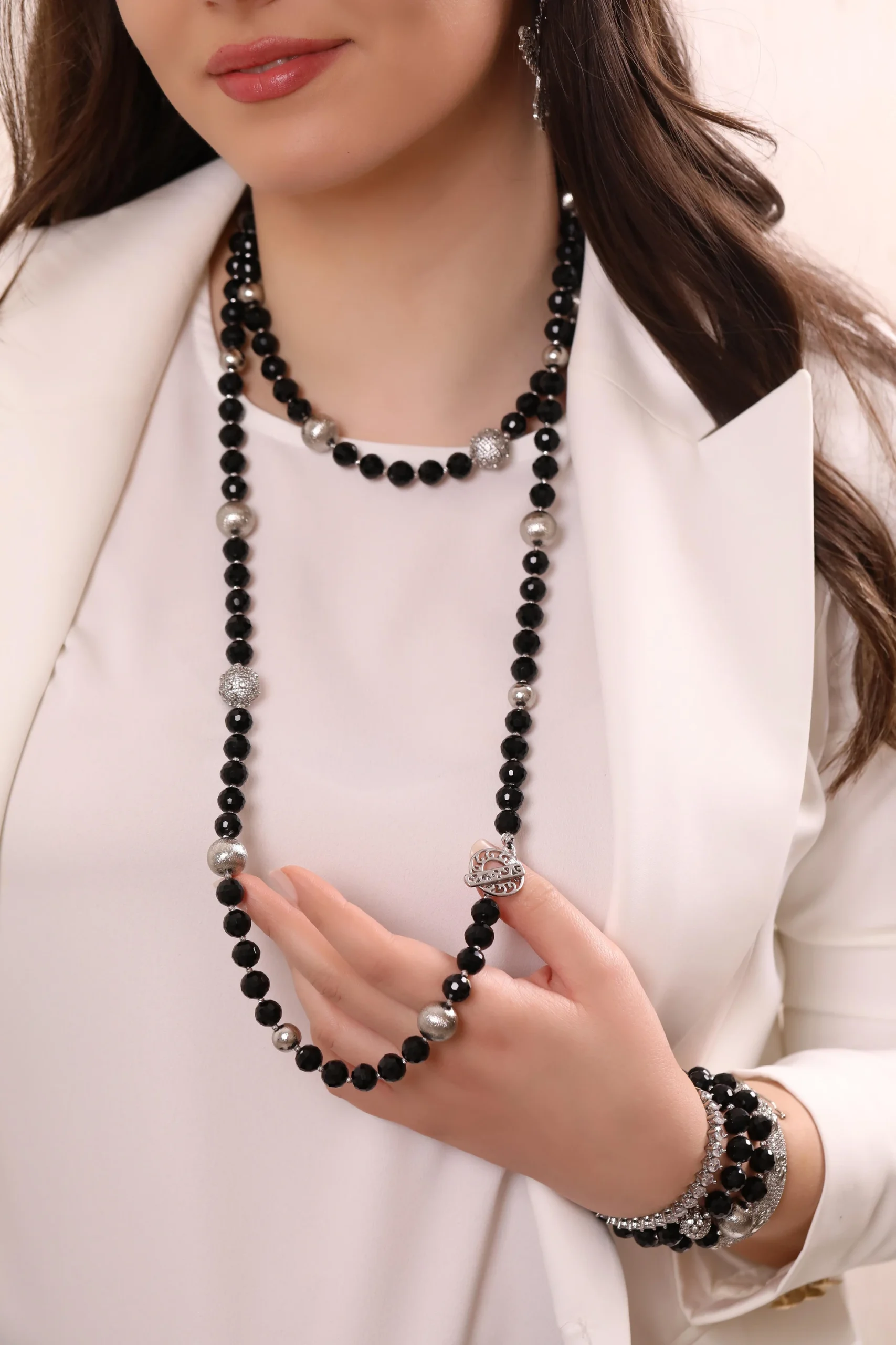“ONIKS Elegance, hem zarafeti hem de fonksiyonelliği bir araya getiriyor. Siyahın asil duruşunu ve oniks taşının gücünü yansıtan bu özel tasarım kolye, ergonomik yapısıyla hem kısa hem de uzun şekilde kullanılabilir. Her anınıza şıklık katarken, tarzınıza özgün bir dokunuş ve pratiklik sunar. Hem günlük kullanım hem de özel anlar için mükemmel bir seçim.”