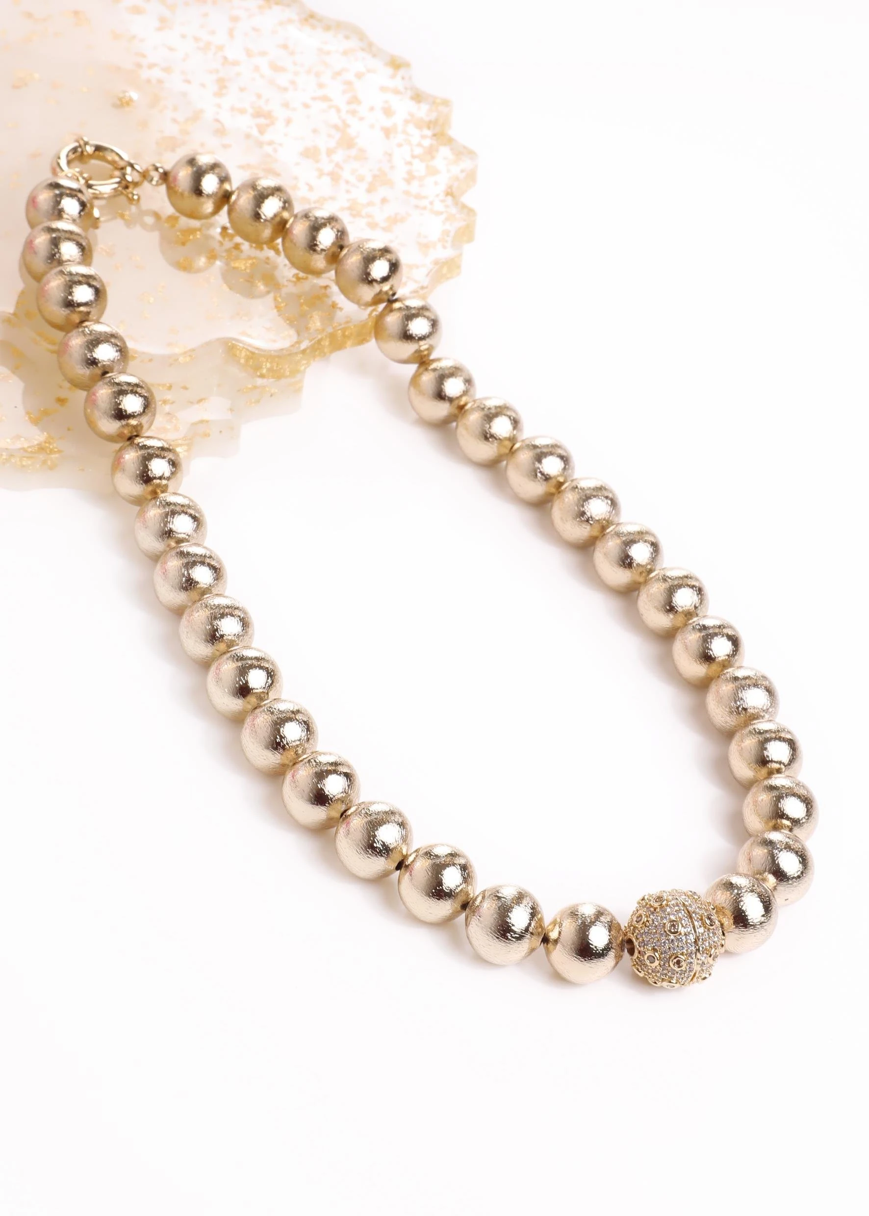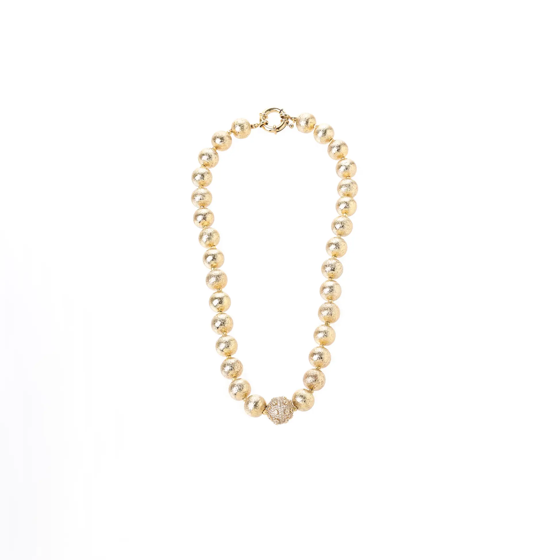 “Zarif taşlarla süslenmiş top şekli, şıklığınızı öne çıkarırken, modern ve zarif tasarımıyla her kıyafeti tamamlar. Göz alıcı ışıltısıyla stilinizi parlatan bu kolye, her anınıza sofistike bir dokunuş katıyor.”