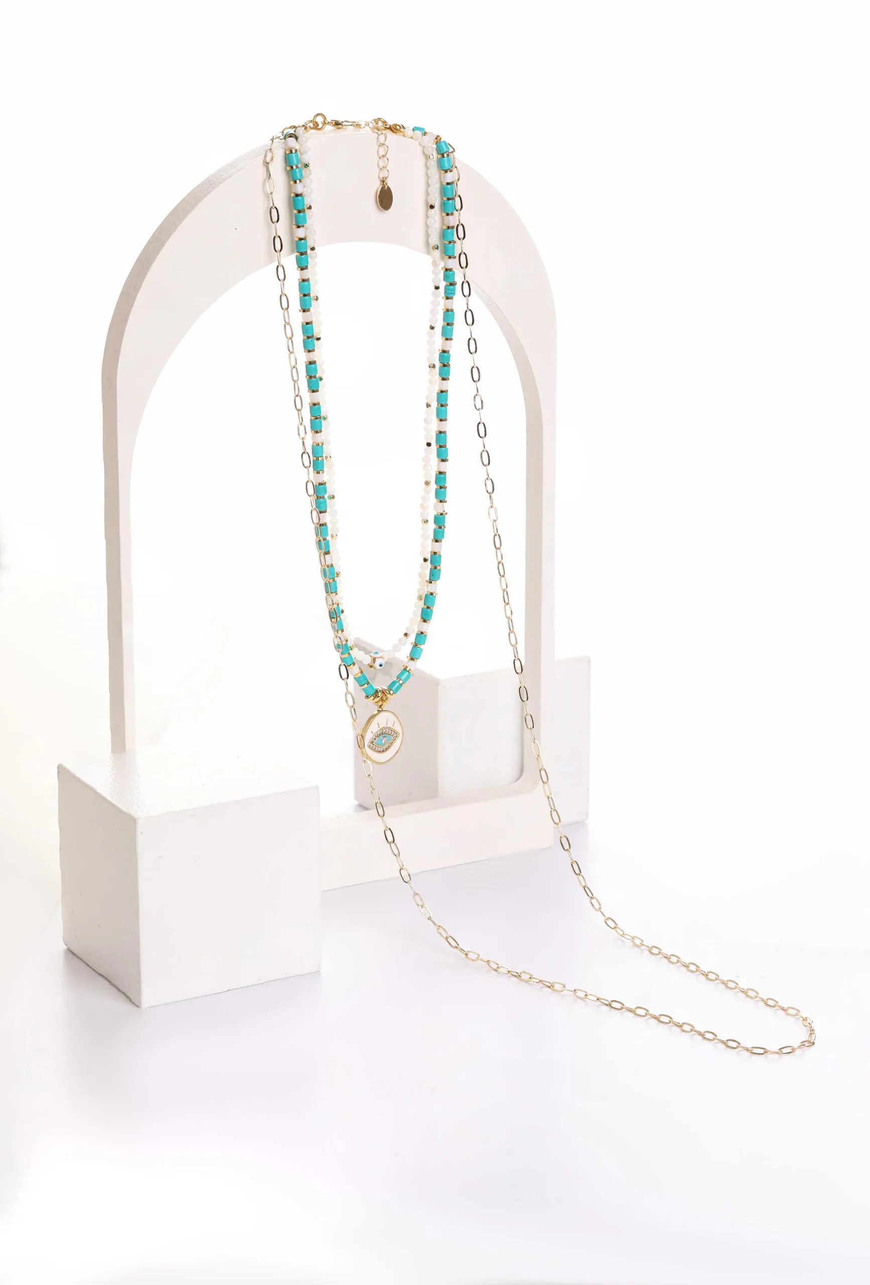 "Doğanın zarafetiyle buluşan iki değerli taş: Turkuaz ve sedef. Bu kolye, turkuazın enerjik mavi tonları ile sedefin ışıltılı zarafetini bir araya getiriyor. Her anınıza ferahlık ve zarafet katan bu tasarım, hem stilinizi hem de ruhunuzu canlandıracak."