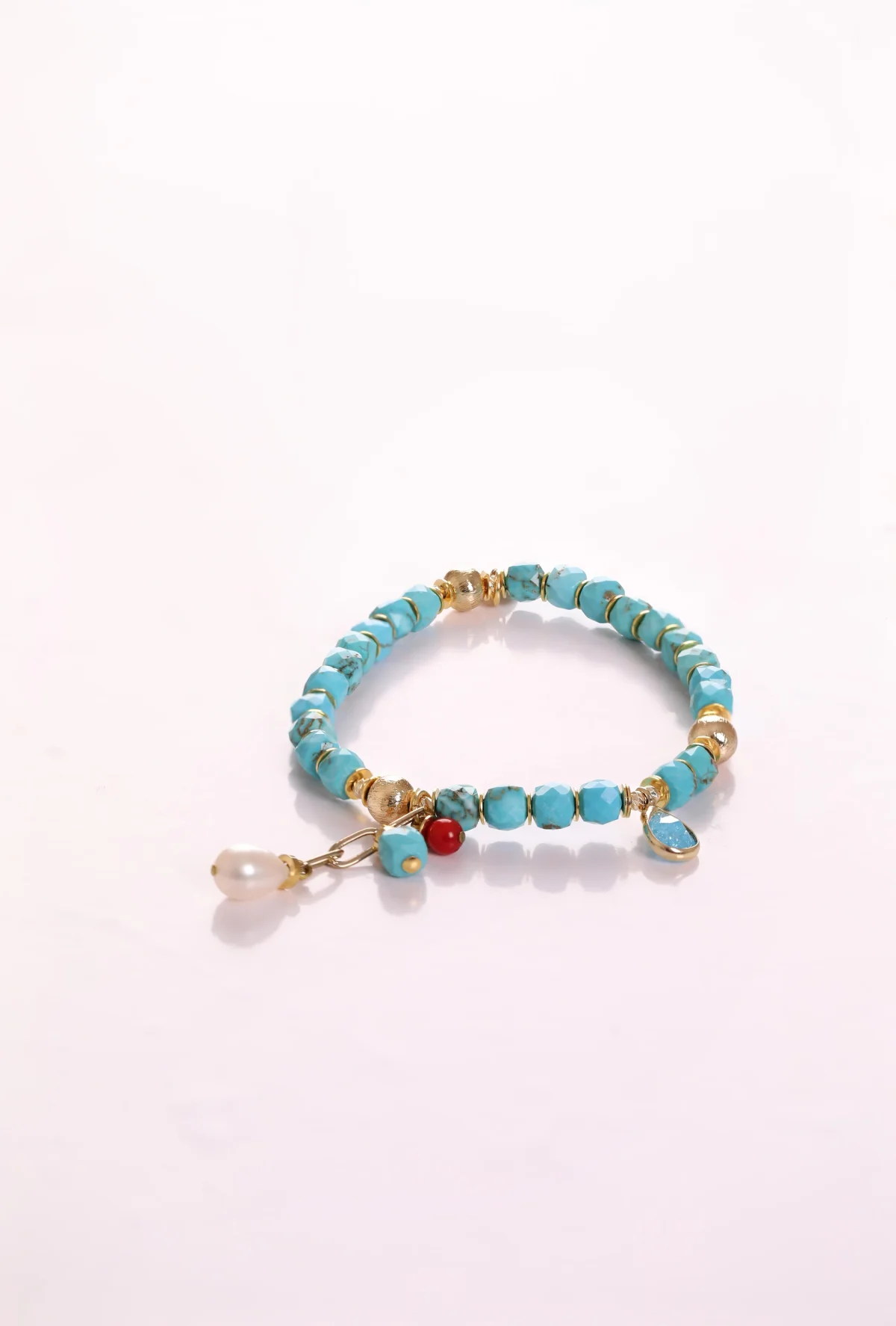 Zarafetin ve doğanın mükemmel birleşimiyle tasarlanmış, mercan ve inci detaylarıyla bezenmiş özel kesim turkuaz taşı bileklik. Her bir taşın enerjisiyle stilinize değer katın, kendinizi şımartın…