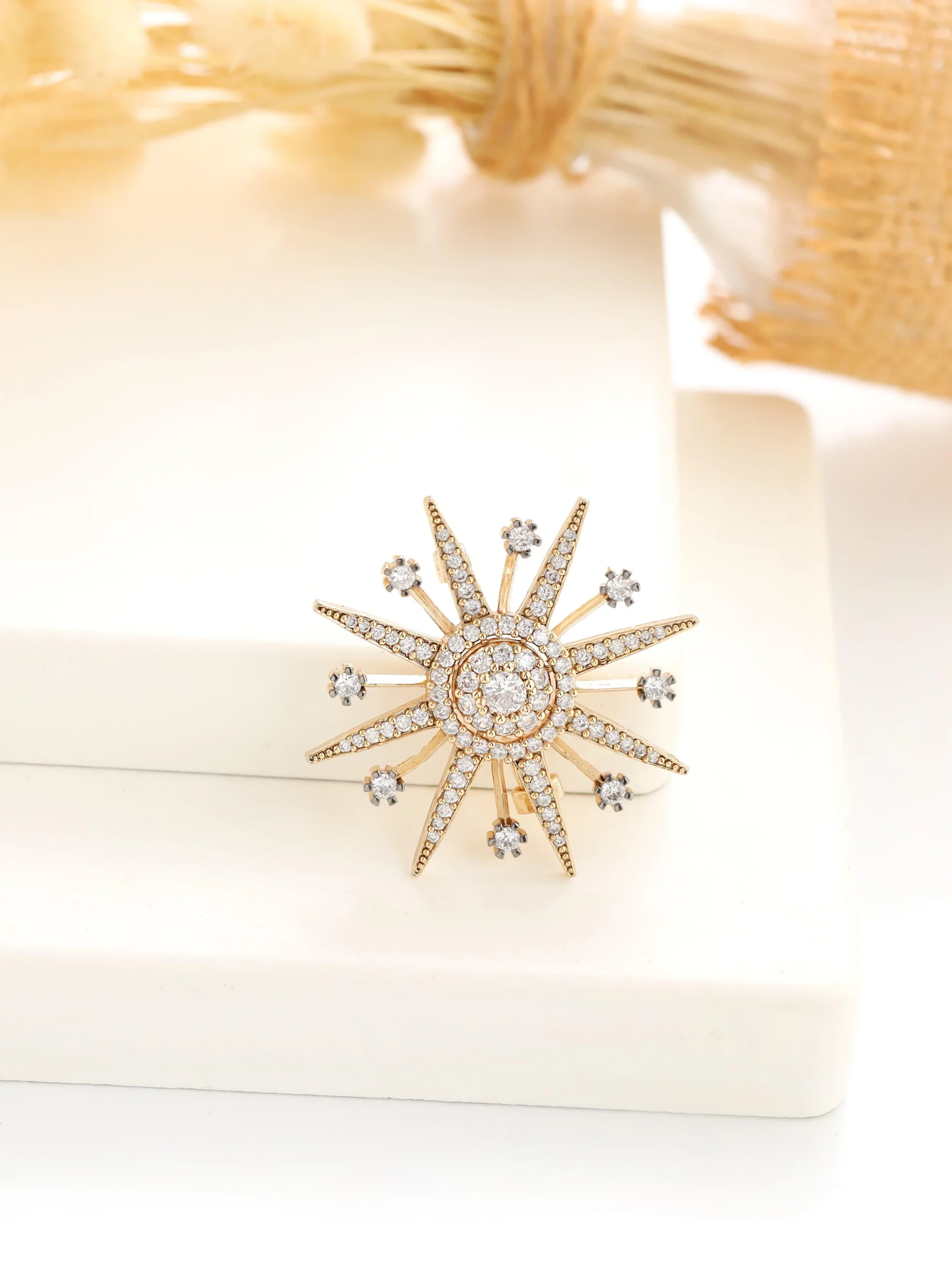 “Gecenin parlayan yıldızı, şimdi stilinizde: Yıldız broş. Zarif tasarımıyla ışıldayan bu broş, her anınıza parıltı katarken, yıldızın büyüleyici simgesini taşıyor. Her detayıyla şıklık ve zarafet sunan bu özel tasarım, stilinizi öne çıkarırken, sizlere her adımda ışıltılı bir dokunuş ekliyor.”