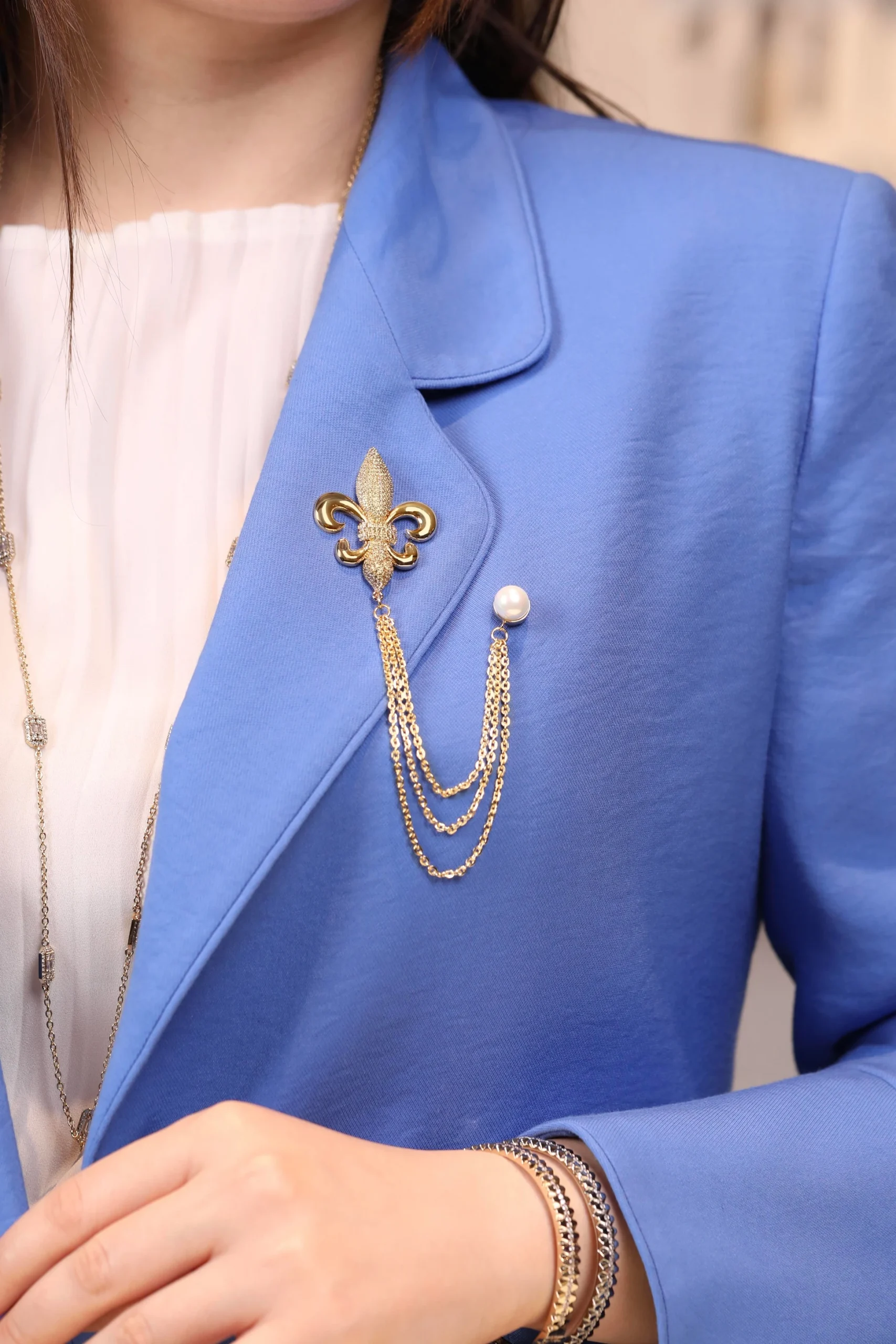 “Zarafetin ve asaletin simgesi: İnci detaylı zambak broş. İnciyle süslenmiş zarif zambak çiçeği, şıklığınızı ve zarafetinizi vurgularken, her adımınıza sofistike bir dokunuş ekler. Doğanın en zarif figürlerinden biriyle stilinize zarif bir anlam katın.”