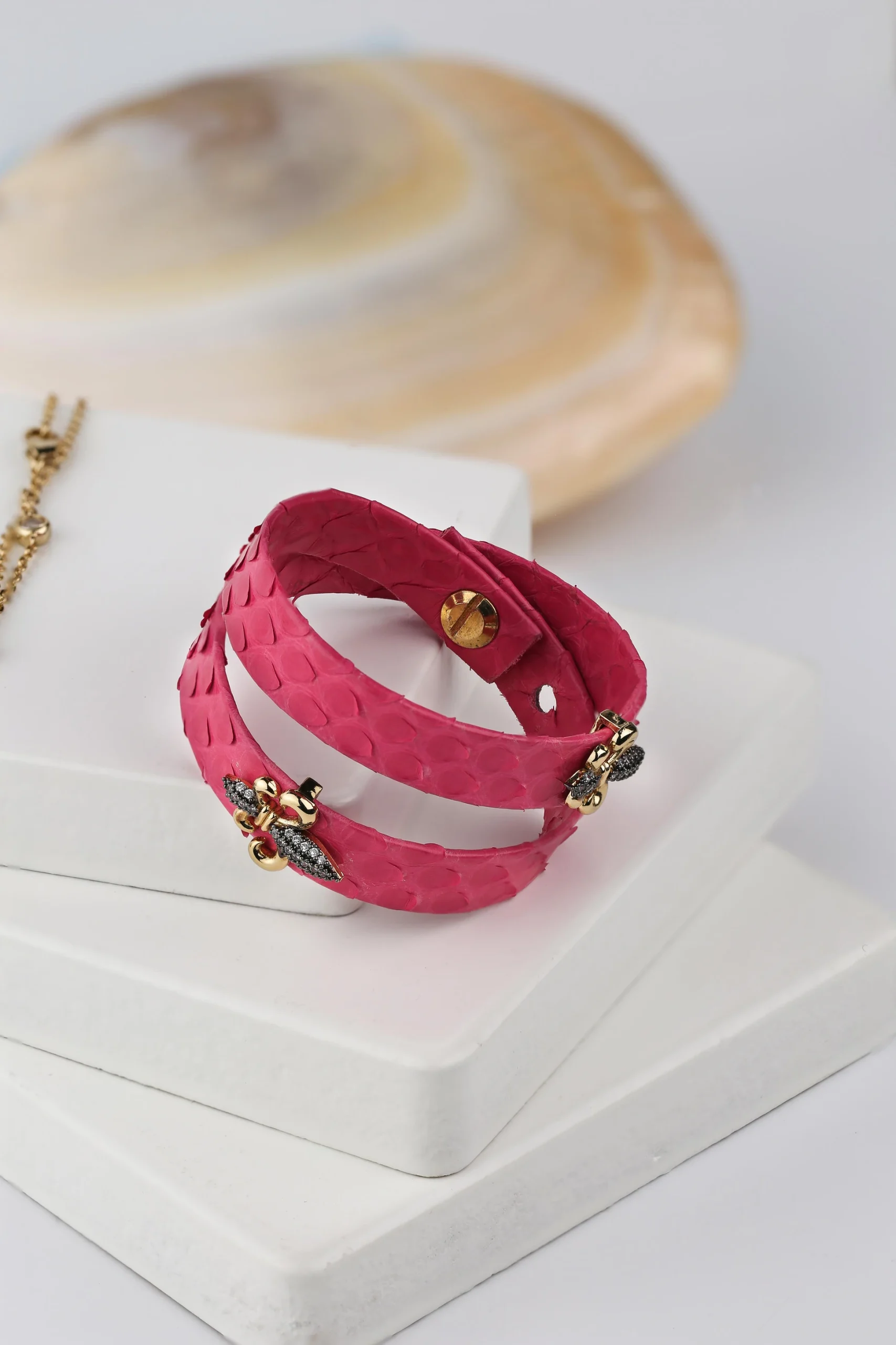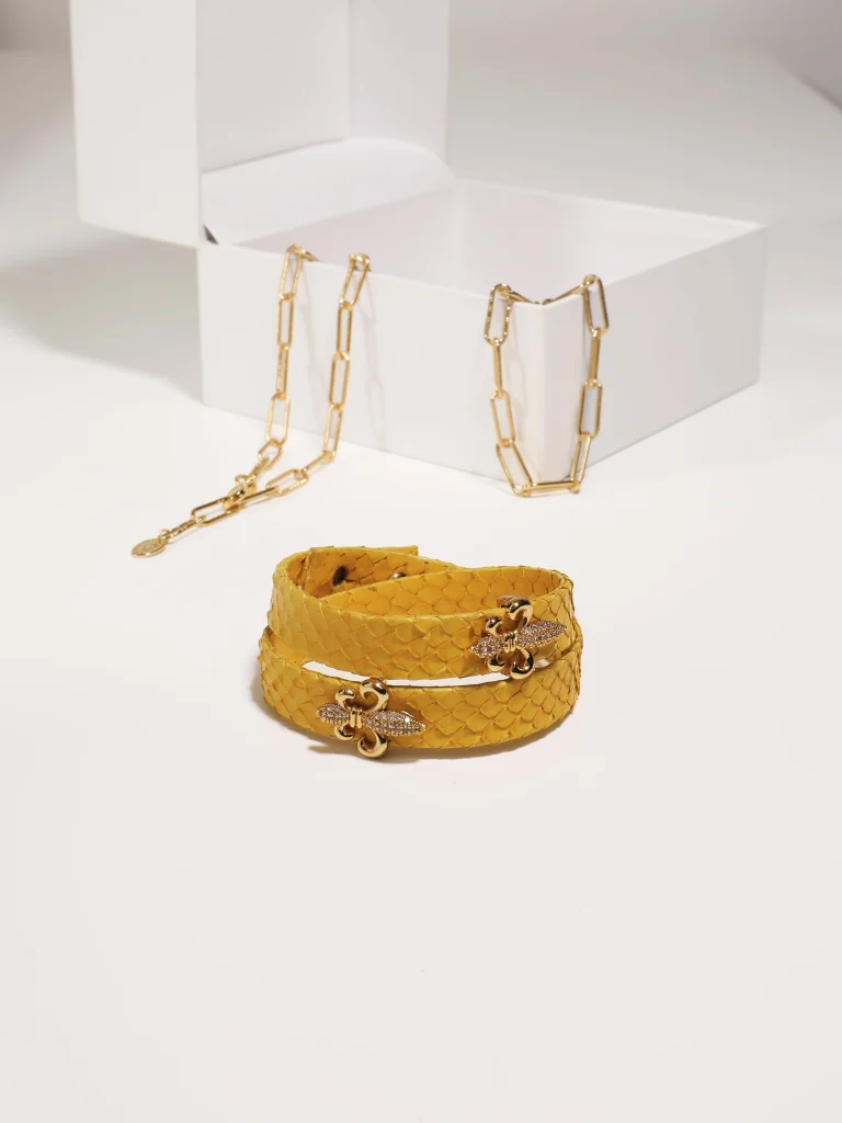“Pembe rengin naifliği ve zambak çiçeğinin zarafeti birleşiyor. Bu özel tasarım deri bileklik, her detayıyla zarif ve enerjik bir dokunuş sunuyor. Tarzınıza şıklık ve tazelik katarken, zambak figürünün anlamıyla her anınıza özgün bir güzellik ekliyor.”
