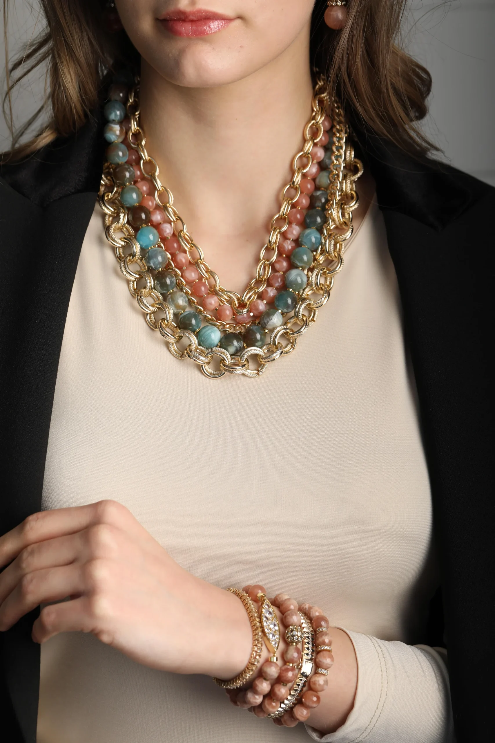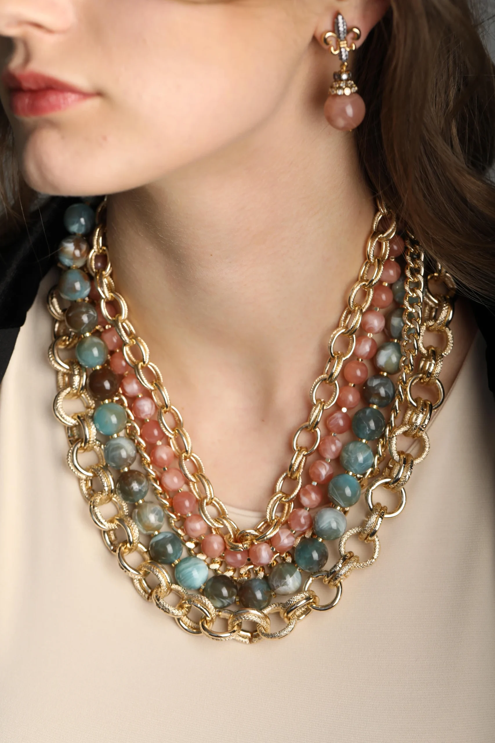 İthal zincir ve mika taşlar ile hazırlanmış kolyemizin uzunluk ölçüsü 45/50 cm'dir.